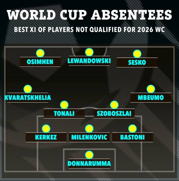 영국 타블로이드지 '더 선'이 월드컵 본선행에 실패한 선수들로만 구성된 베스트 일레븐을 선발해 공개했다. 베스트 일레븐의 몸값은 무려 5억 9600만 파운드(약 1조 1955억원)나 된다. 기준이 되는 포메이션은 3-4-3이다.