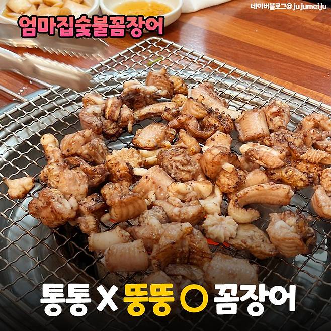 밖에서 연탄불에 직화로 구워주는 꼼장어를 맛볼 수 있는 곳이에요. 꼼장어를 주문하면 전복과 산낙지 등 싱싱한 해산물이 기본 반찬으로 나와요.