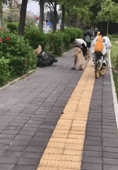 그런데 주인이 잠시 손을 놓자마자 스쿠터가 한쪽으로 기울어지면서 주인과 강아지 모두 순간 얼어붙었고, 결국 첫째 강아지가 바닥으로 떨어져 버렸습니다.