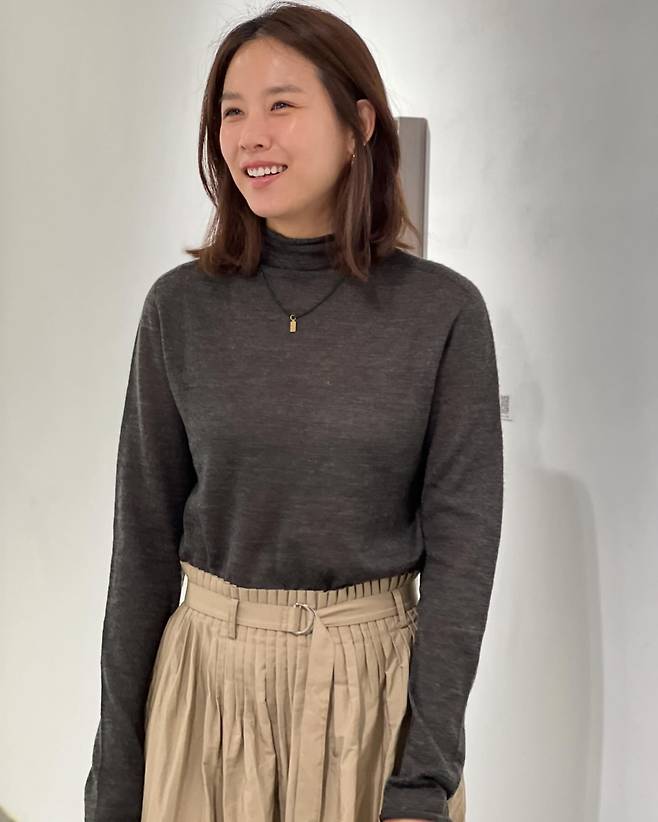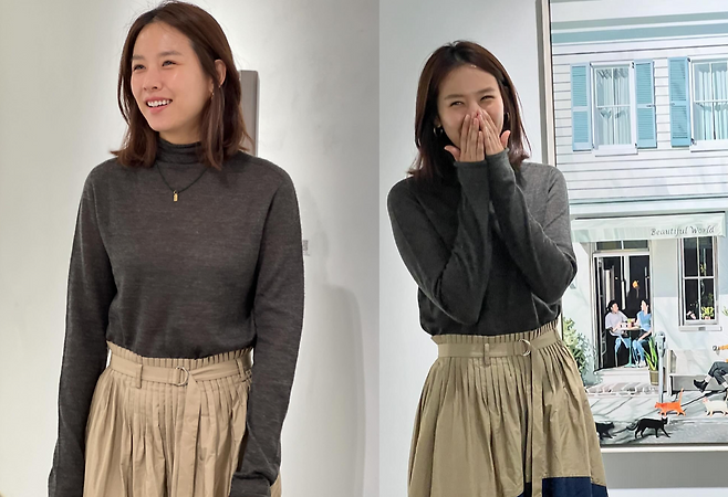 조윤희는 챠콜색 티셔츠에 투톤 롱스커트와 스니커즈를 매치해 캐주얼한 느낌을 줬습니다.