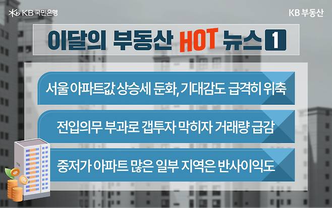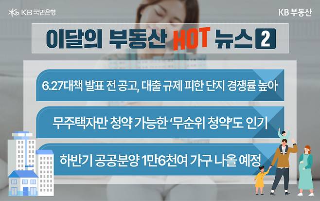 주택담보대출을 조이는 6.27 '가계부채관리강화방안'이 나온 지 한달이 지났습니다. 서울, 수도권 주택 시장은 관망세로 돌아서고 거래량도 크게 줄었습니다. 7월 부동산 시장에도 많은 일들이 있었는데요. KB부동산이 화제가 된 부동산 이슈와 정책을 짚어드립니다.