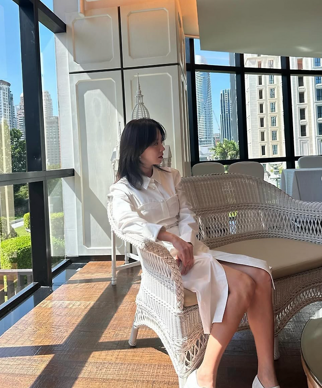 배우 송지효거 화이트 셔츠 원피스를 입고 햇살 아래 따스한 분위기가 눈길을 끌었어요.