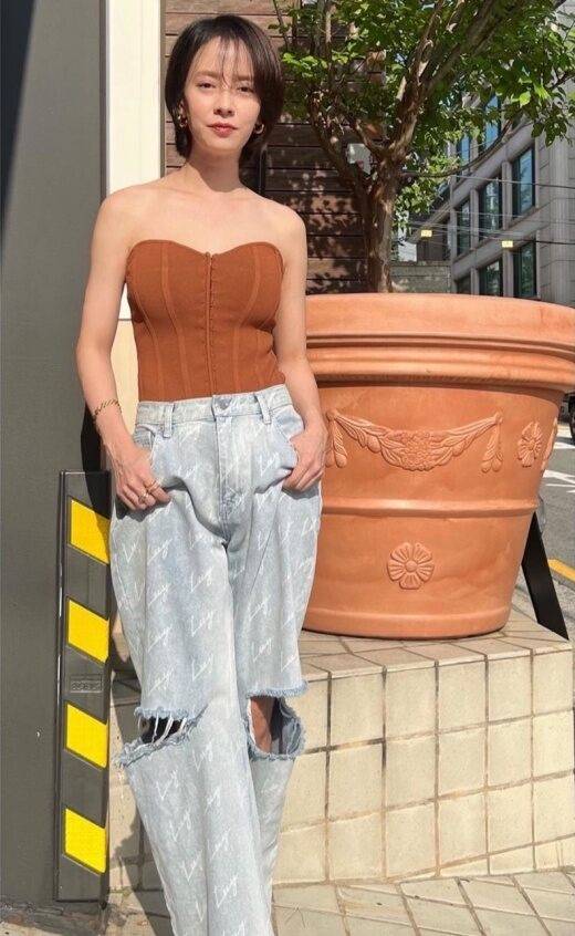 송지효는 브라운 튜브톱에 데미지 워싱 와이드 데님을 매치해 Y2K 감성의 스트릿 룩을 연출했어요.