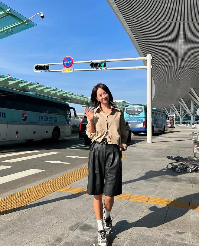공항에서 찍은 사진 속 송지효는 베이지 셔츠에 블랙 레더 버뮤다 팬츠, 운동화와 양말을 매치해 꾸안꾸 패션을 연출했어요.