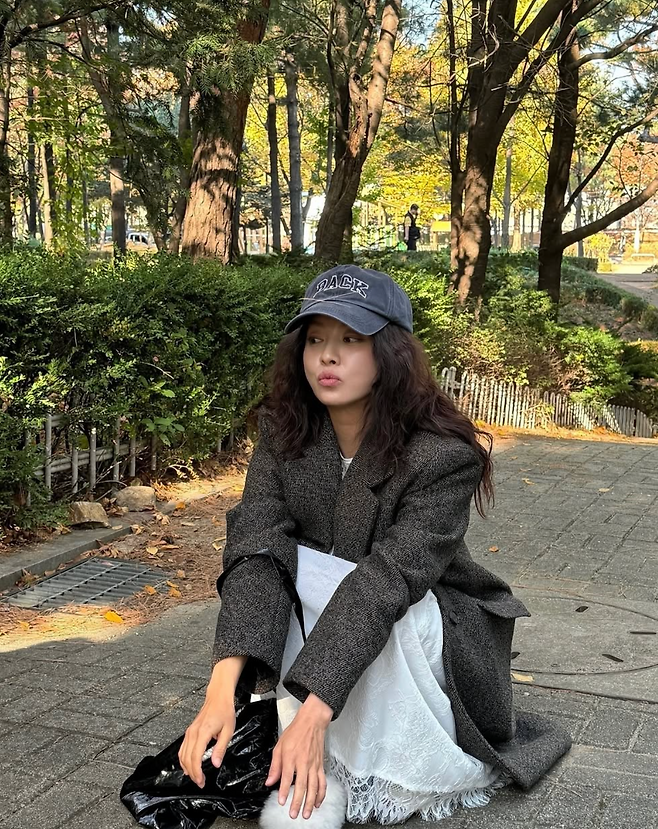 산책길 송지효의 과감해진 스타일 감각이 눈에 띄었는데요. 레이스 원피스 위에 박시한 울 코트, 여기에 캡모자와 글로시한 광택이 포인트인 백으로 코디한 레트로 믹스 스타일이에요.