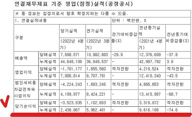 앞서 2월1일 발표된 SK하이닉스의 2022년 4분기 성적표는 그야말로 실망스러운 수치였죠. 위 표에서처럼 당기순손실은 3조5235억원에 달했고요. 연간 누계 이익을 절반 이상 까먹는, 그야말로 처참한 실적이었습니다.