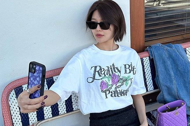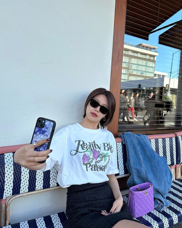 자유롭고 자연스러운 분위기의 사진 속에서, 수영은 여유로운 핏의 티셔츠에 스커트를 매치해 편안하면서도 세련된 ‘꾸안꾸’ 여름룩을 선보였다.
