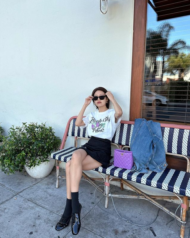 특히 시선을 끈 것은 그녀가 착용한 그래픽 티셔츠. 무심하게 티셔츠 밑단을 스커트에 살짝 넣은 연출과 함께, 빈티지한 감성이 더해진 그 티셔츠는 보는 이들로 하여금 브랜드를 궁금하게 만들기에 충분했다.