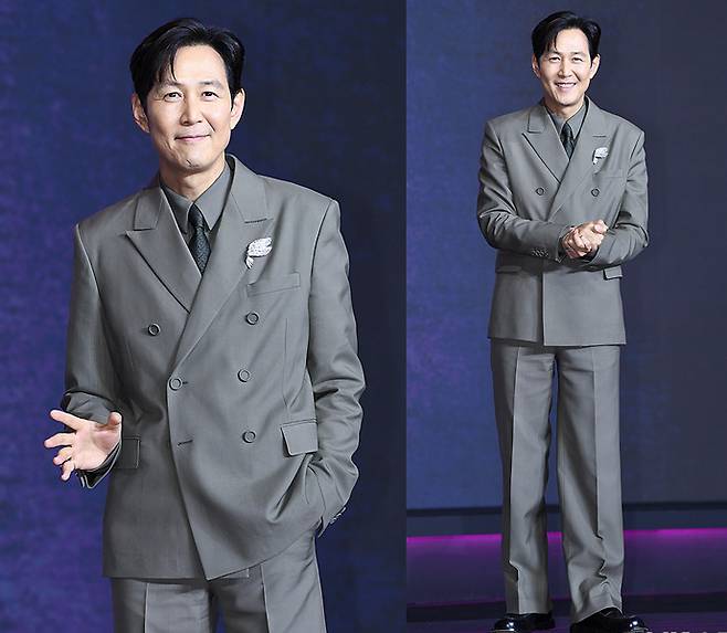 이정재가 더블브레스트 카키색 슈트로 고급스러운 카리스마를 드러냈습니다.