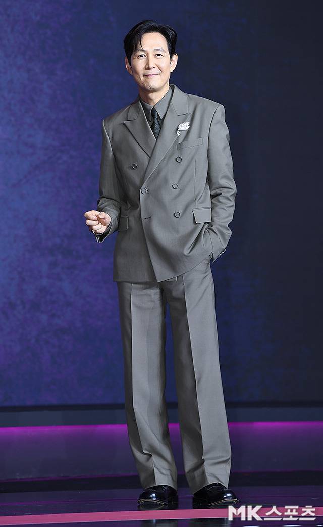 이정재는 적당히 루즈한 핏의 슈트와 포멀한 셔츠, 그 위에 톤온톤으로 매치된 카키색 넥타이는 클래식한 매력을 더했고, 가슴 포켓에 꽂은 은색 브로치가 단정하면서도 디테일을 살리는 포인트가 됐습니다.