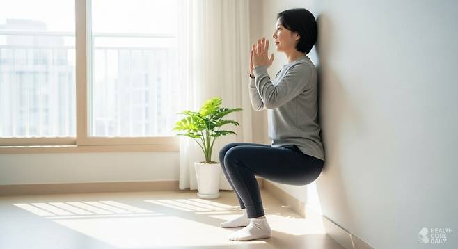 혈압 조절에는 유산소 운동뿐 아니라 근력 운동도 중요하다. 근육이 많을수록 나트륨 배출과 혈관 확장이 원활해지고, 혈압 조절 능력도 향상된다. 그중에서도 벽 스쿼트는 등척성(정지 상태에서 근육 수축) 운동으로, 혈관 긴장을 완화하고 혈류를 개선하는 데 효과적이다.