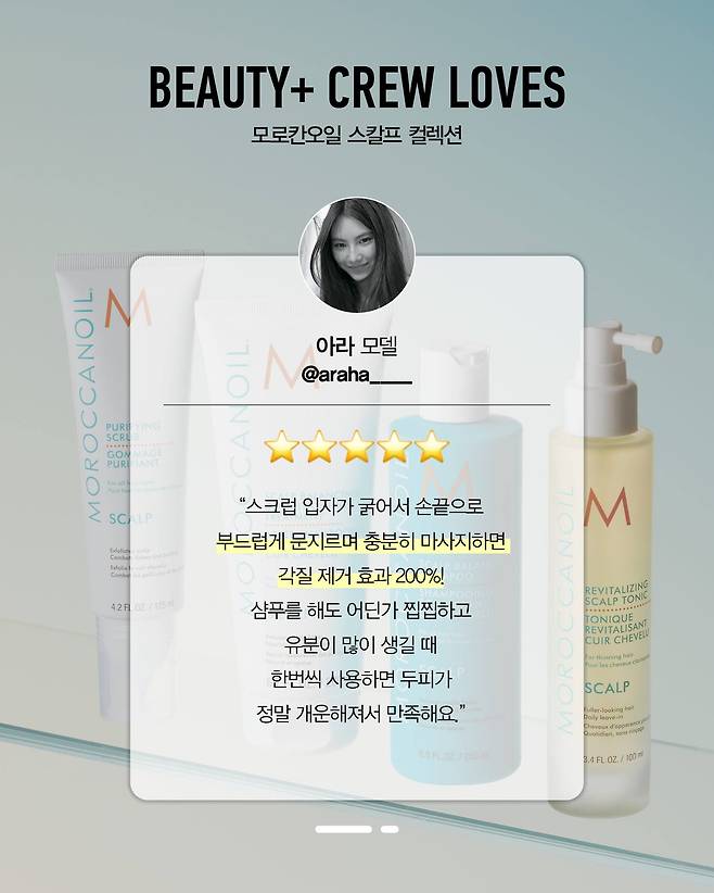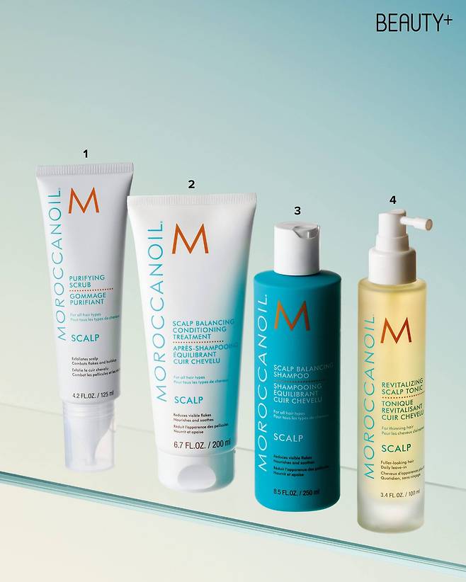 모로칸오일의 신제품 스칼프 컬렉션은 샴푸, 컨디셔너, 스크럽, 스칼프 토닉의 4단계 집중 케어 루틴으로 구성되어 있으며, 브랜드의 기술력과 보태니컬 테라피 블렌드 성분을 담아 건강한 두피 환경을 조성해준다.