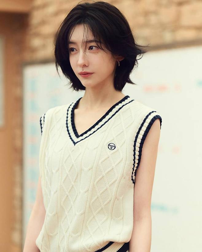 박지현은 이번 착장에서 아이보리 컬러의 니트 베스트와 플리츠 미니스커트로 단정하면서도 청량한 무드를 연출했다. 네이비 스트라이프 포인트가 들어간 니트 베스트는 다이아몬드 패턴이 엠보싱된 디자인으로 클래식한 스포츠웨어의 매력을 더했다. 특히 넥라인과 밑단, 그리고 스커트 밑자락에 들어간 브랜드 로고 자수가 전체 스타일링에 완성도를 부여했다.