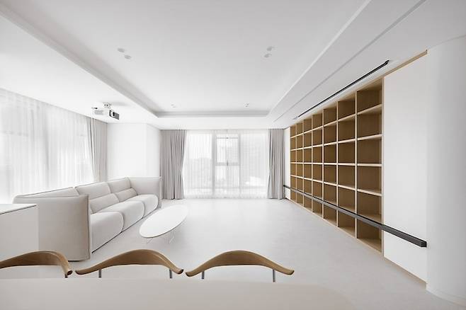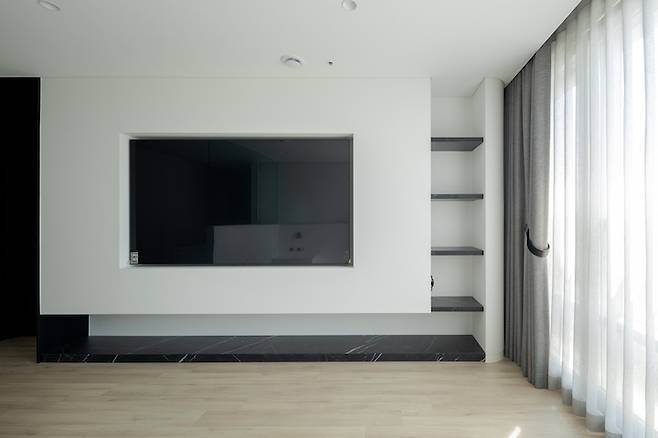 같은 타입의 공간에 TV가 없는 거실을 여러 번 제작한 경험이 있는데, 대부분은 이렇게 천장 안쪽으로 롤스크린을 설치해 한쪽 벽에서 수납과 시청 두 가지 기능을 가능케 하고 있어요.