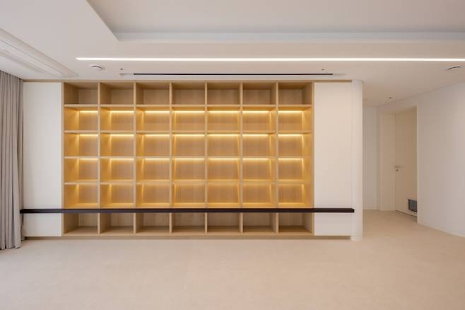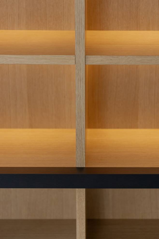 디자인적인 요소를 가미하기 위해 밋밋한 무늬목 책장 대신 섹션 안쪽으로 라인조명을 길게 설치해 전시장 같은 느낌을 주는 하드웨어를 구상했어요.