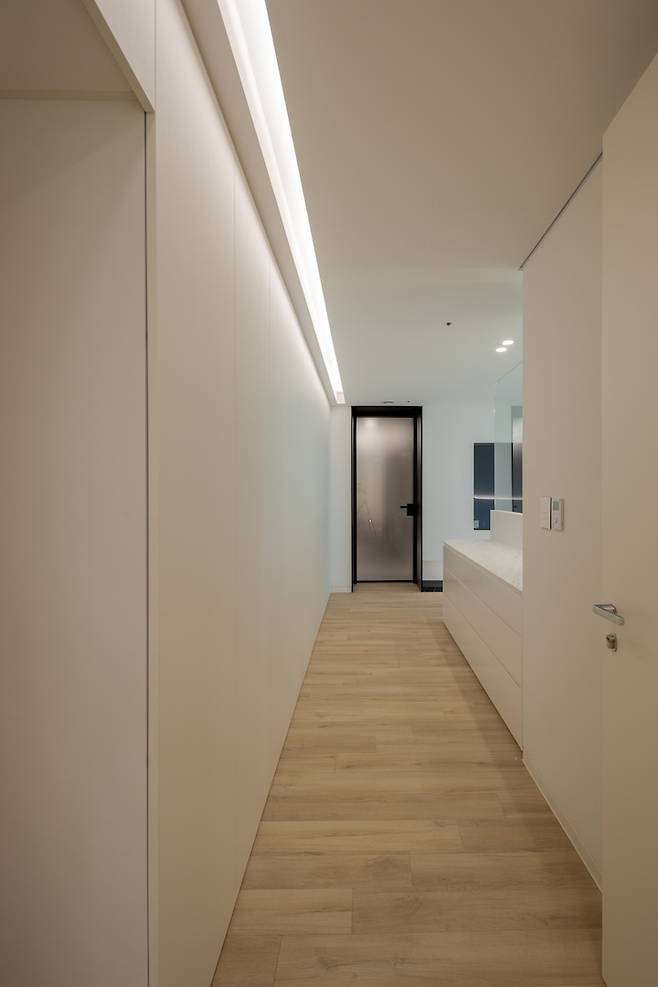아무래도 침구류 및 옷의 수납을 위해 키큰장을 넓힌 복도만큼의 면적에 넓게 설치했고, 깔끔한 느낌을 위해 라인등을 길게 매립시켜 올곧게 뻗은 직선의 느낌을 주고, 라인조명만으로는 부족한 조도를 보완하기 위해 간접조명 여러 개를 추가로 설치했어요.