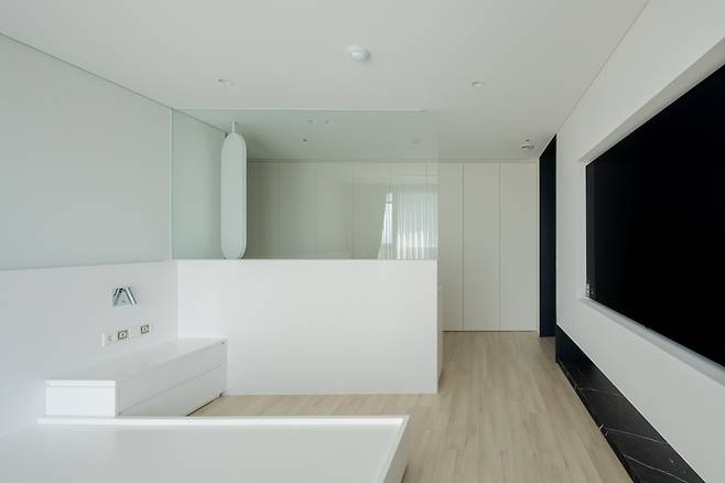 안방의 베란다만큼을 확장하고 침실 공간으로 편입해 실용성을 높이는 데에 집중한 침실의 모습.