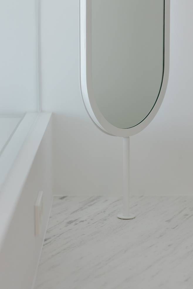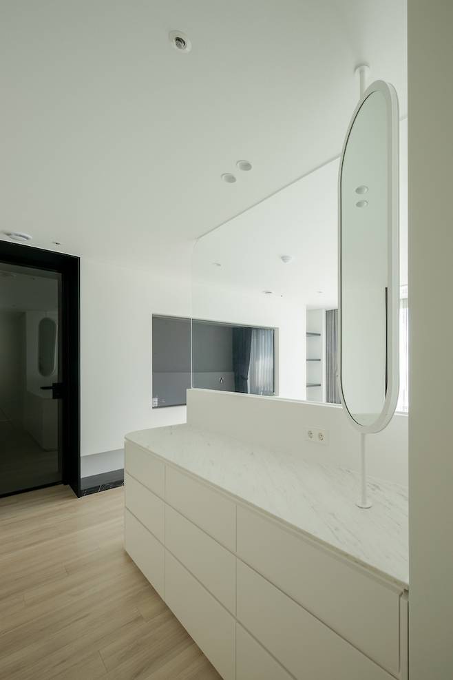 라운딩 서랍과 어울리는 동그란 타원형의 거울도 배치했어요. 사소한 부분까지 신경 쓴 만큼 최선을 다했던 현장이라 더 애착이 가는 것 같아요.