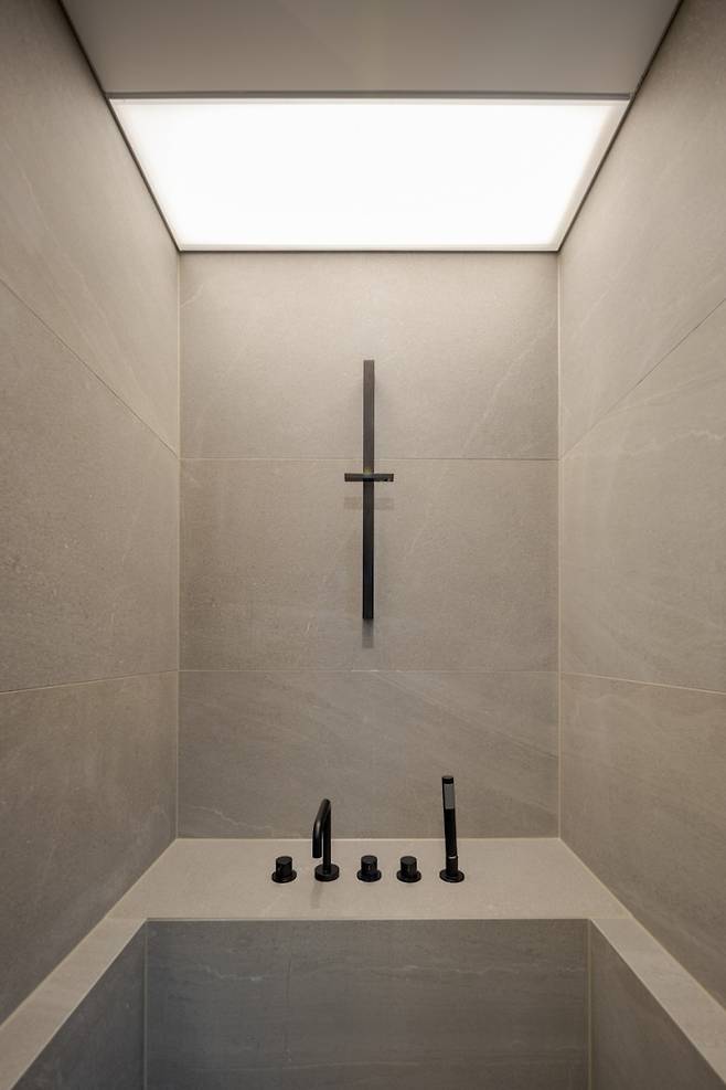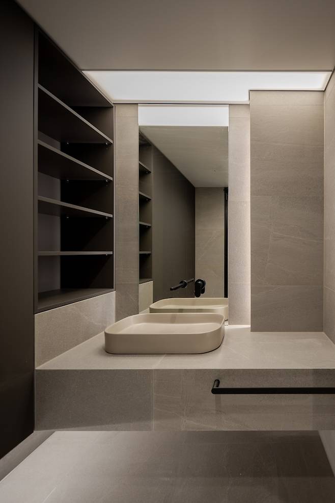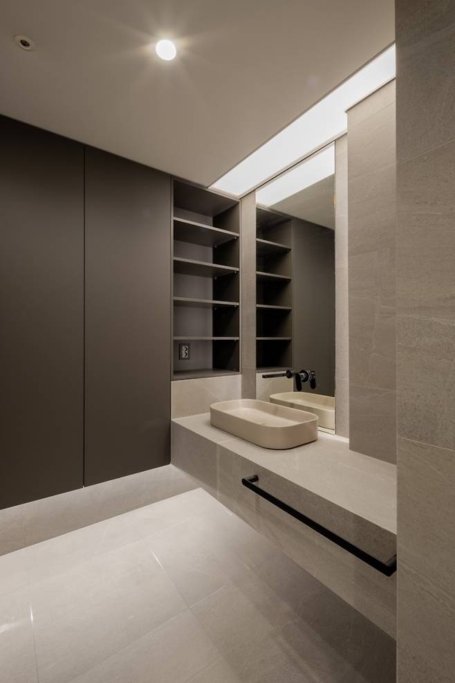 어느 순간부터 간접등을 설치하지 않는 집이 오히려 찾기 어려워졌어요. 하지만 간접조명을 아주 여러 개 달아주지 않는 이상은 조도를 조절하기가 어려워요. 특히 이번 욕실처럼 어두운 공간에는 메인 광원이 반드시 존재해야 해요.