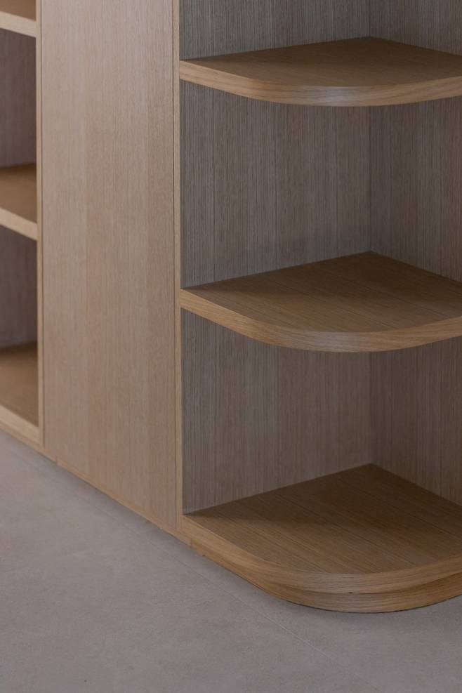 책을 정말 많이 소장하고 계신 고객님을 위해 기존에는 tv를 넣어야 할 자리에는 무늬목 책장을 제작해 드렸어요. 이번 현장은 디자인은 물론, 무엇보다도 고객님께서 살면서 겪을 경험들을 위주로 콤팩트한 수납공간을 마련하는 것도 아주 중요한 작업이었어요.