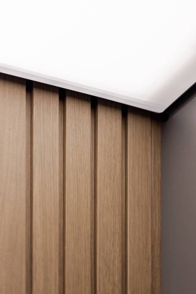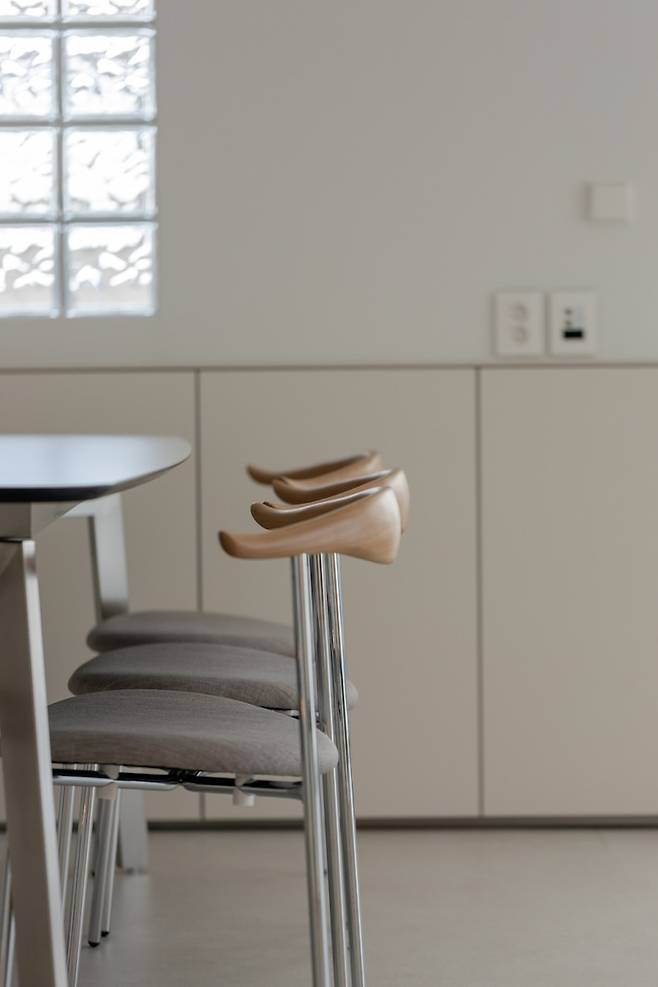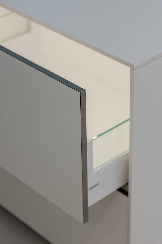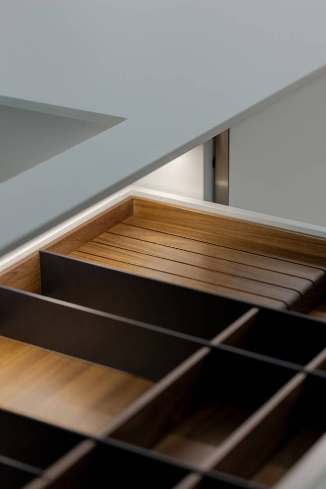 주방 서랍 쪽 아일랜드는 위쪽을 유리로 디자인해 서랍 내부가 훤히 보이도록 했는데요. 유리 아래로 보이는 내부까지도 디테일하게 여러 톤의 우드를 사용는데요. 주방에 상대적으로 우드의 비중이 낮다고 판단되어 서랍 아래의 섹션을 나눠주는 역할로 우드를 선택했어요.