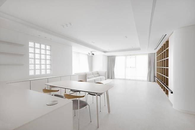 높인 천고를 통해 개방감을 주었으니, 화이트 우드 인테리어의 핵심인 깔끔함을 강조하기 위해 천장 안쪽으로 간접등을 매입했습니다.