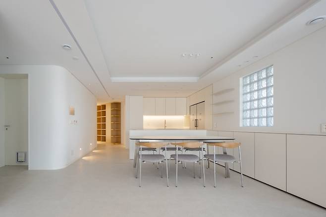 공간 확장 효과에 크게 한몫하는 '마이너스 몰딩'을 연출하기 위해 천장의 안쪽을 파내어 가구와 조명을 매립시켜 디자인했어요.