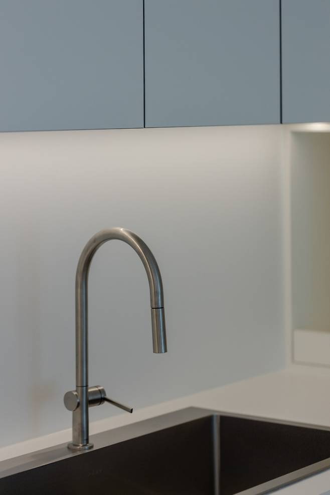 터치 도어의 측면 마감도 깔끔한 느낌을 자아냄과 동시에 이색이 지지 않도록 스테인리스를 사용했습니다. 주방에 들어간 세라믹은 동일한 제품을 사용해 주방 전체의 일관성과 완성도를 높였어요.