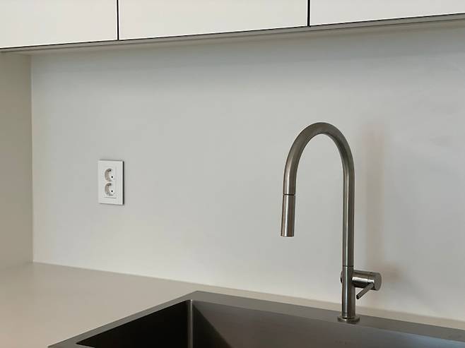 주방에는 여러 가지 가전이 필요하기 때문에 콘센트는 필수로 들어가야만 하는데, 일반적인 디자인의 콘센트 대신 가운데의 작은 원을 누르고 뚜껑을 돌리면 코드를 꼽을 수 있는 구멍이 나오는 유니크한 제품으로 셀렉 해드렸어요 ^^