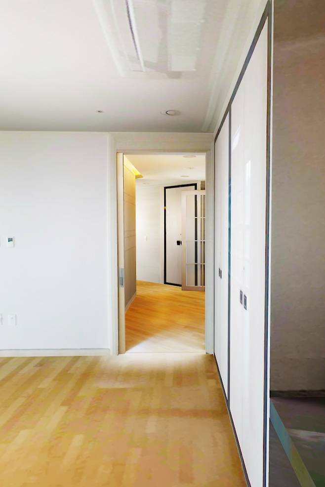현관을 지나 바로 찍은 모습이에요. 기존 복도는 길고 안방까지의 거리가 상당했기에 안방의 절대 면적이 좁았기에 복도를 줄이고 베란다를 확장하여 안방 내에서의 공간을 더욱 확보했습니다.