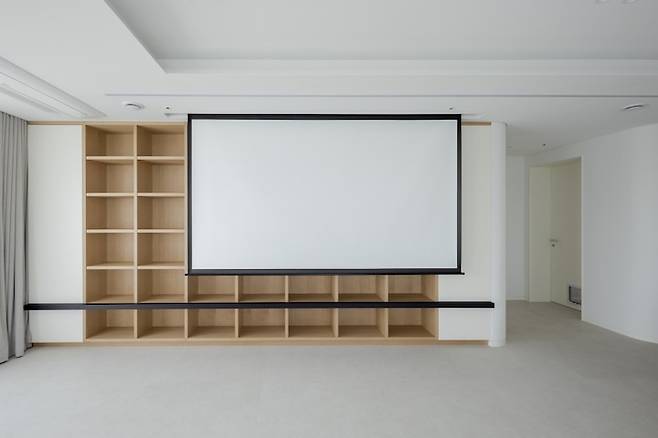같은 타입의 공간에 TV가 없는 거실을 여러 번 제작한 경험이 있는데, 대부분은 이렇게 천장 안쪽으로 롤스크린을 설치해 한쪽 벽에서 수납과 시청 두 가지 기능을 가능케 하고 있어요.