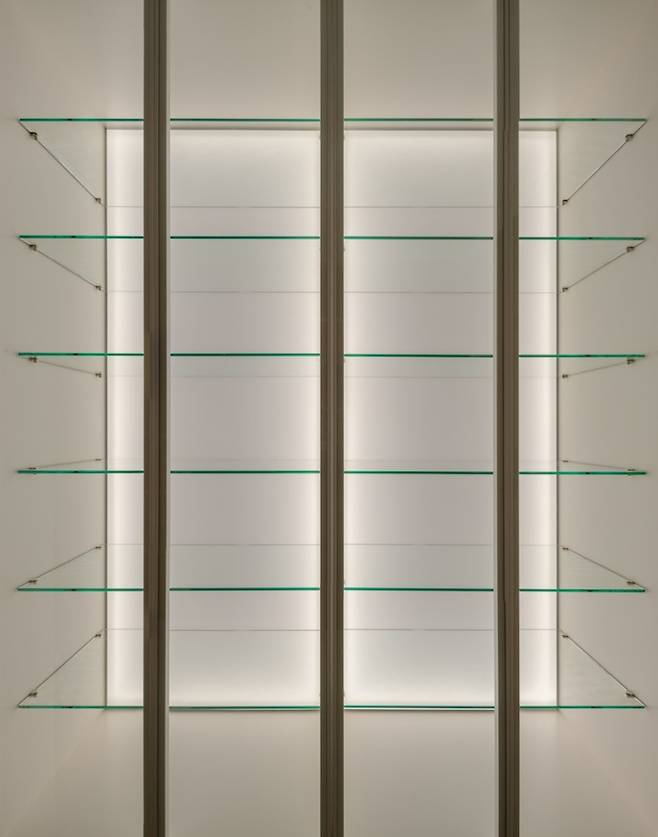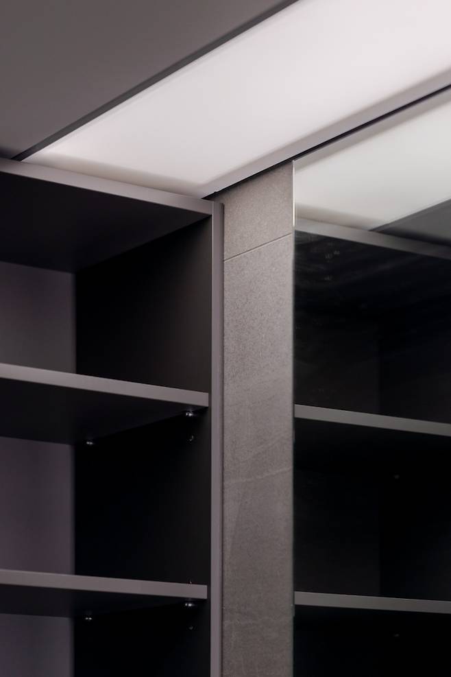 디자인적인 요소를 가미하기 위해 밋밋한 무늬목 책장 대신 섹션 안쪽으로 라인조명을 길게 설치해 전시장 같은 느낌을 주는 하드웨어를 구상했어요.