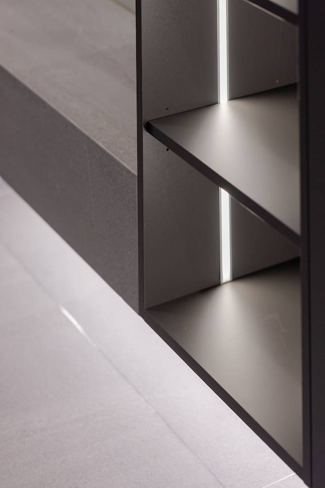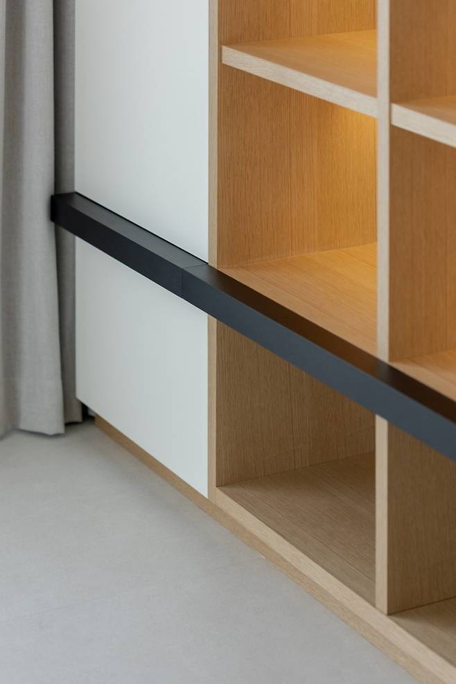책장의 하단을 나눠주는 매트한 소재의 블랙 바를 추가로 디자인해 모던한 느낌과 시선이 집중되는 포인트가 되어 주어주고 있어요.