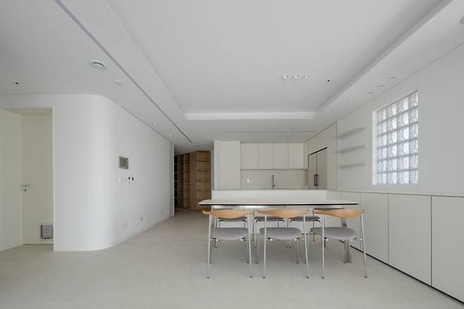 공간 확장 효과에 크게 한몫하는 '마이너스 몰딩'을 연출하기 위해 천장의 안쪽을 파내어 가구와 조명을 매립시켜 디자인했어요.