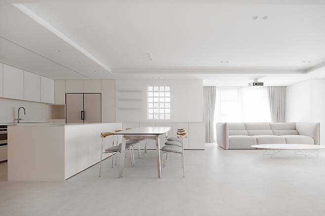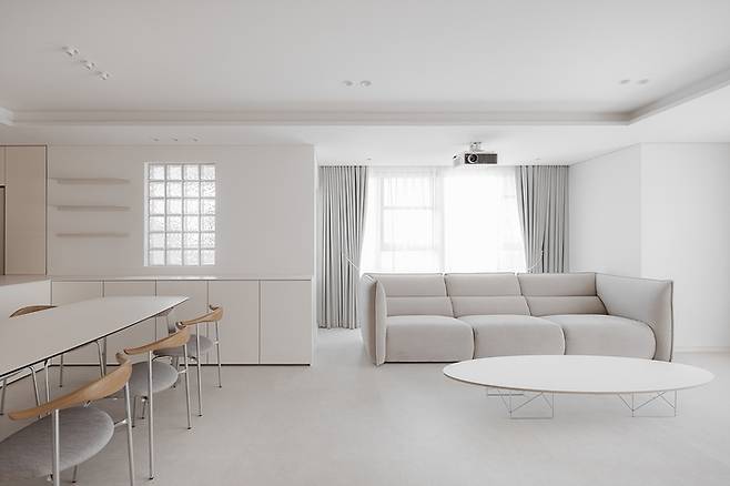 높인 천고를 통해 개방감을 주었으니, 화이트 우드 인테리어의 핵심인 깔끔함을 강조하기 위해 천장 안쪽으로 간접등을 매입했습니다.