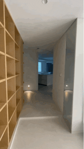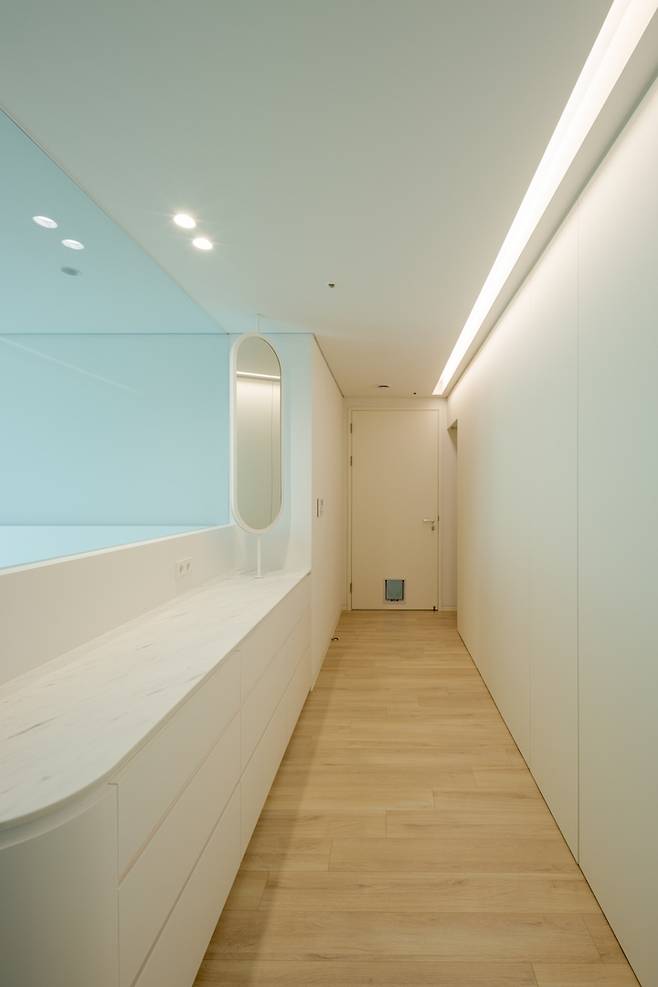 아무래도 침구류 및 옷의 수납을 위해 키큰장을 넓힌 복도만큼의 면적에 넓게 설치했고, 깔끔한 느낌을 위해 라인등을 길게 매립시켜 올곧게 뻗은 직선의 느낌을 주고, 라인조명만으로는 부족한 조도를 보완하기 위해 간접조명 여러 개를 추가로 설치했어요.