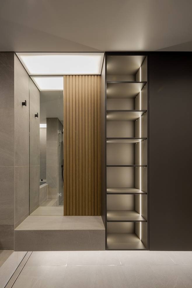 안방 아트월 젠다이와 우측의 선반도 같은 자재의 천연 대리석을 사용해 무게감 있으면서도 공간 전체에 통일감을 줄 수 있었어요.