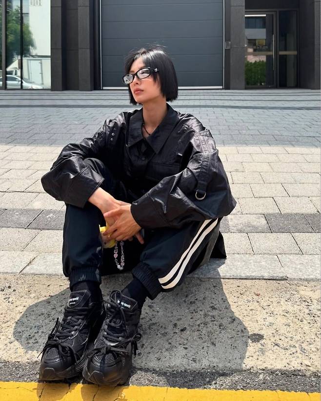 나나님은 블랙 팬츠와 앵클 부츠를 매치하여 시크하면서도 세련된 룩을 완성했습니다. 셔츠 형태를 그대로 살리면서도 메탈 오브제를 더해 하드한 디테일을 살린 것이 특징입니다.