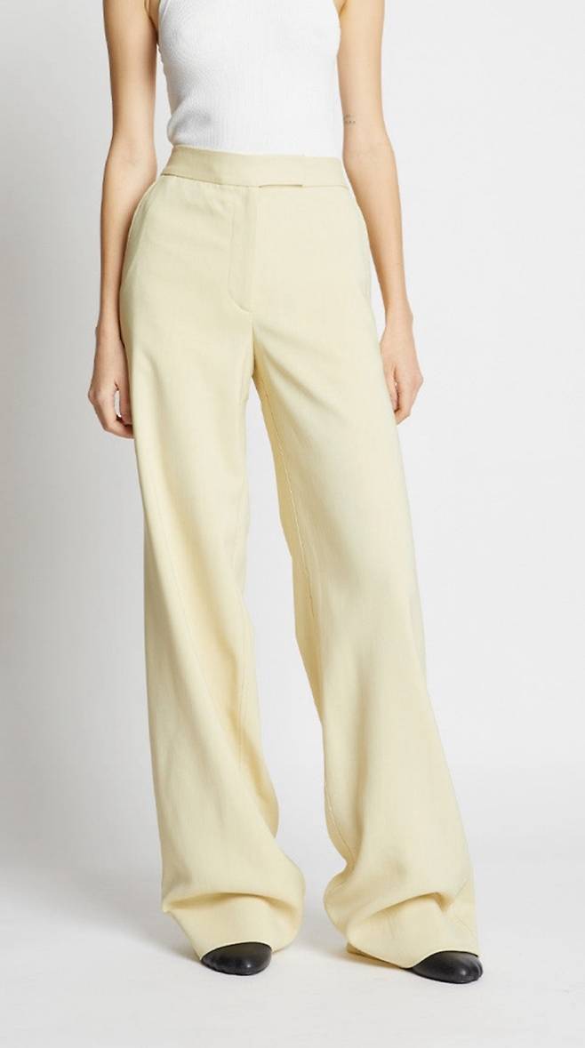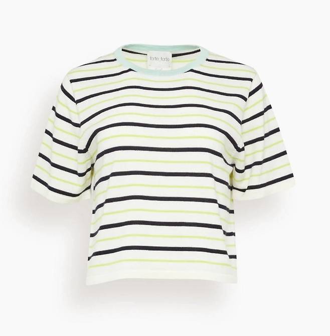 연노랑 바탕에 네이비 스트라이프가 들어간 티셔츠는 톤이 부드럽고 시원한 인상을 주고,거기에 따뜻한 옐로우 팬츠를 매치하니까 화면 전체가 ‘편안함 + 생기’로 꽉 찼죠
