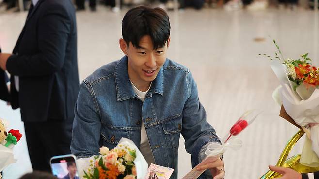 경호원들에게 둘러싸여 걸어 나오던 손흥민은 팬들의 간절한 외침을 듣고는 팬들에게 다가가 꽃다발과 선물, 편지 등을 차례로 받았습니다.