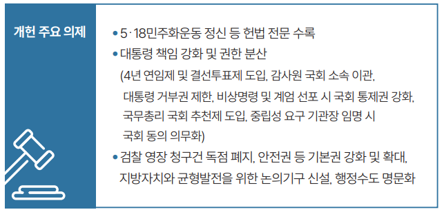 아울러 대통령 거부권 제한, 비상명령 및 계엄 선포시 국회 통제권 강화, 국무총리 국회 추천제 도입 등의 내용도 개헌의 주요 의제로 설정했습니다. 모두 이 대통령의 대선 당시 공약입니다. 이 밖에 감사원 국회 소속 이관, 중립성 요구 기관장 임명시 국회 동의 의무화, 행정수도 명문화 등과 관련한 개헌 논의도 진행될 예정입니다. 이를 위해 정부는 국회에 헌법개정특별위원회(개헌특위) 구성을 요청할 방침입니다. 정부는 “개헌 논의 진행 경과에 따라 2026년 지방선거 또는 2028년 국회의원 선거와 동시에 개헌에 대한 국민 찬반 투표를 실시하겠다”고 밝혔습니다.