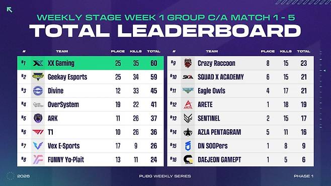 준비된 다섯 매치를 모두 치른 결과, XX게이밍이 총점 60점으로 1위에 올랐다.