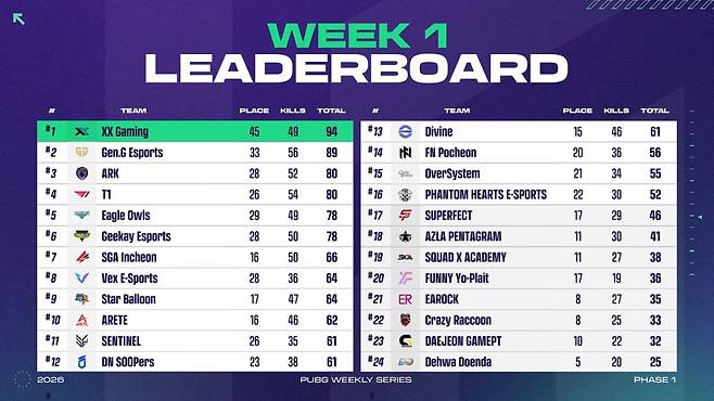 XX게이밍, 90점으로 '위클리 스테이지' 1주차 1위…젠지 2위·아크 3위·T1 4위 (PWS: 페이즈 1) [종합]