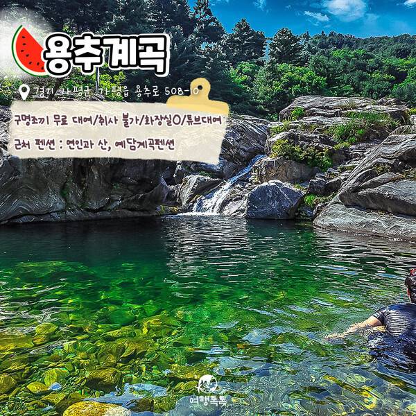 물놀이를 할 수 있는 스팟에는 다이빙을 할 수 있는 절벽은 없지만 수심이 깊고 폭이 넓어 튜브나 구명조끼와 함께 수영, 물놀이 등을 자유롭게 즐길 수 있습니다. 위쪽으로 올라가면 다이빙 명소 '용소폭포'가 있으니 다이빙을 즐긴 뒤 넓은 주차장이 있는 폭넓은 계곡에서 편하게 물놀이를 즐기는 것을 추천합니다.