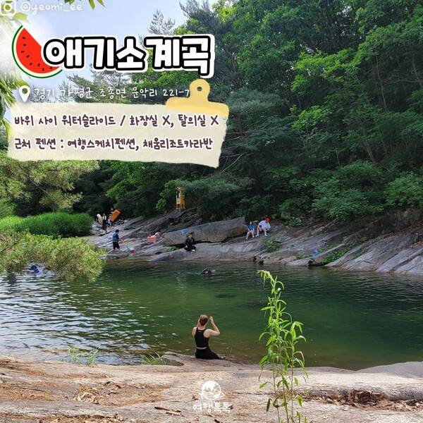 수심이 얕은 곳도 있어 어린이를 동반한 가족 여행에도, 친구들과 함께하는 여행에도 추천하는 잘 알려지지 않은 계곡인데요. 근처에 화장실이나 편의점 등의 편의시설이 없어 사전에 해결하거나 가까운 곳에 숙소를 예약하는 것을 추천합니다.