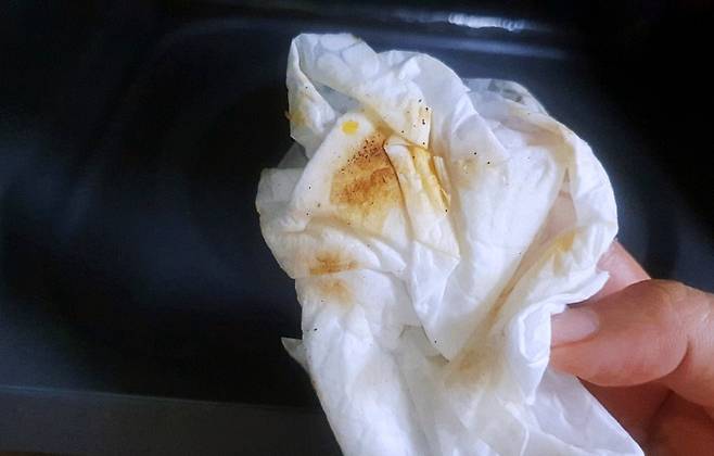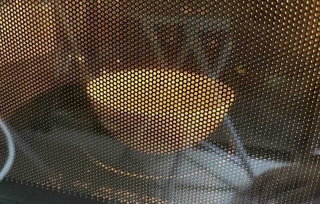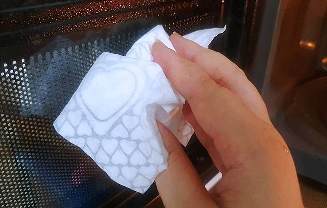 잠시 후 열어보면 전자레인지 내부에 수증기가 가득한데요. 물티슈로 구석구석 닦아줍니다. 그러면 수증기에 불려진 찌든 때가 아주 잘 닦이는데요.