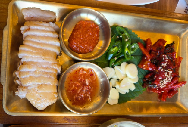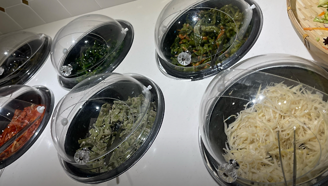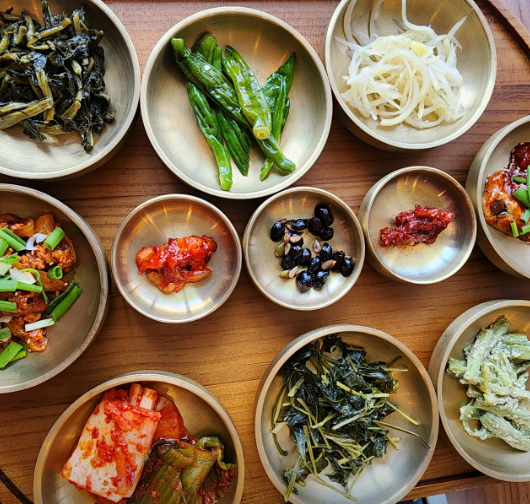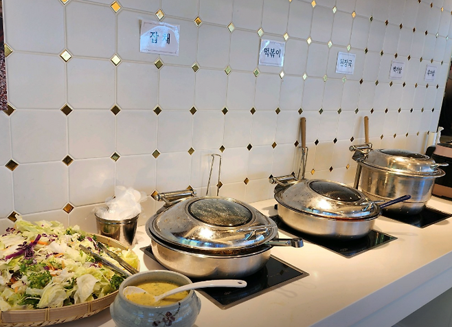 ▶ 기본 반찬도 풍부해 떡볶이, 제육볶음, 콩자반, 어리굴젓 등 다양한 찬과 함께 즐길 수 있고, 어리굴젓·제육 등은 추가 주문 가능합니다.