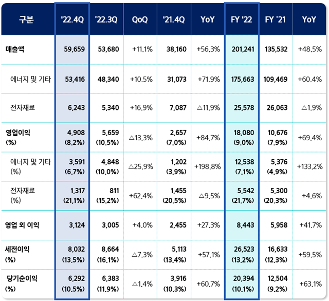삼성SDI는 2022년 4분기 매출 5조 9,659억 원, 영업이익 4,908억 원의 실적을 기록했다. 이는 분기 매출로는 사상 최대이다.