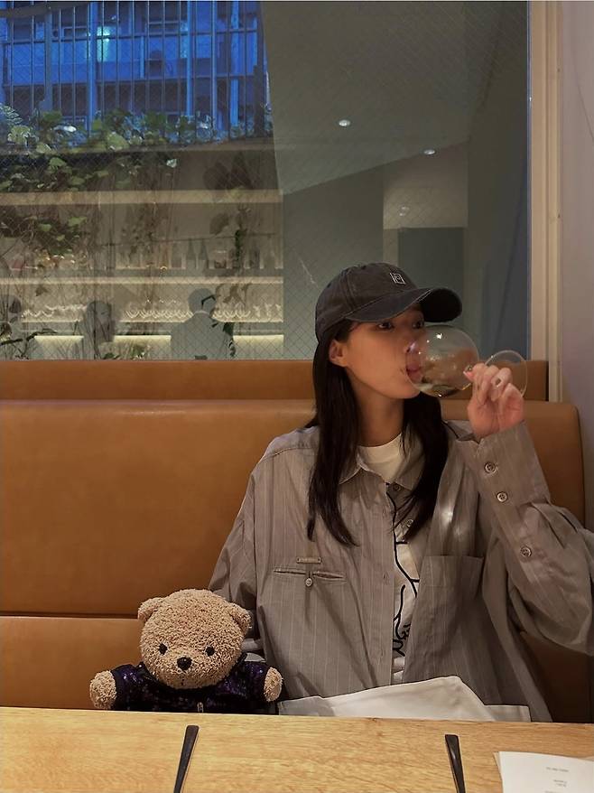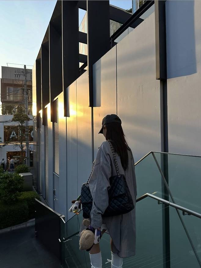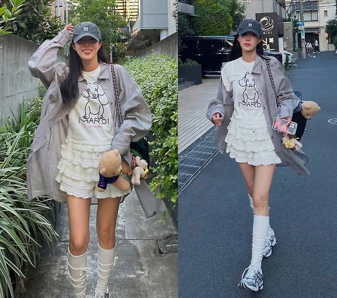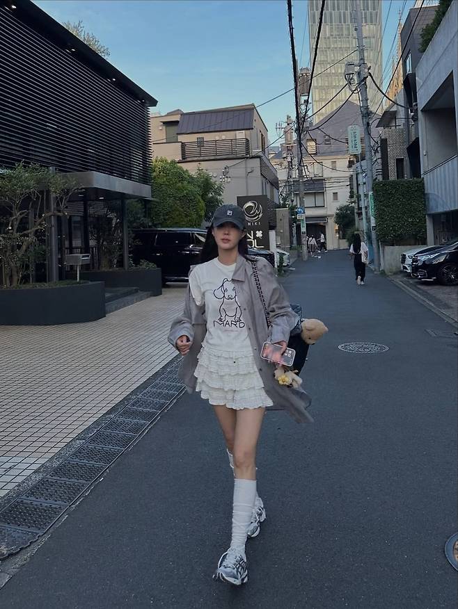 블랙 퀼팅 체인백과 빈티지 무드의 워싱 캡모자, 하이삭스와 러닝화의 믹스매치로 감각적인 레이어드를 완성했으며, 곰인형과 강아지 인형을 소품처럼 들고 있어 힙하면서도 사랑스러운 무드를 연출했습니다.