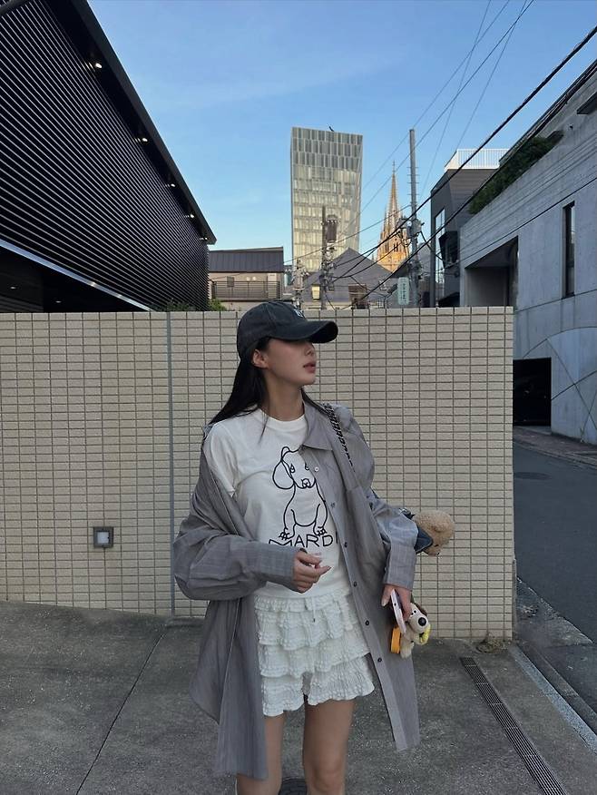 임수향은 프린트 티셔츠와 프릴 디테일이 돋보이는 화이트 미니스커트를 매치해 사랑스러운 소녀미를 강조했고, 여기에 오버핏 그레이 셔츠를 무심하게 걸쳐 내추럴한 분위기를 더했습니다.